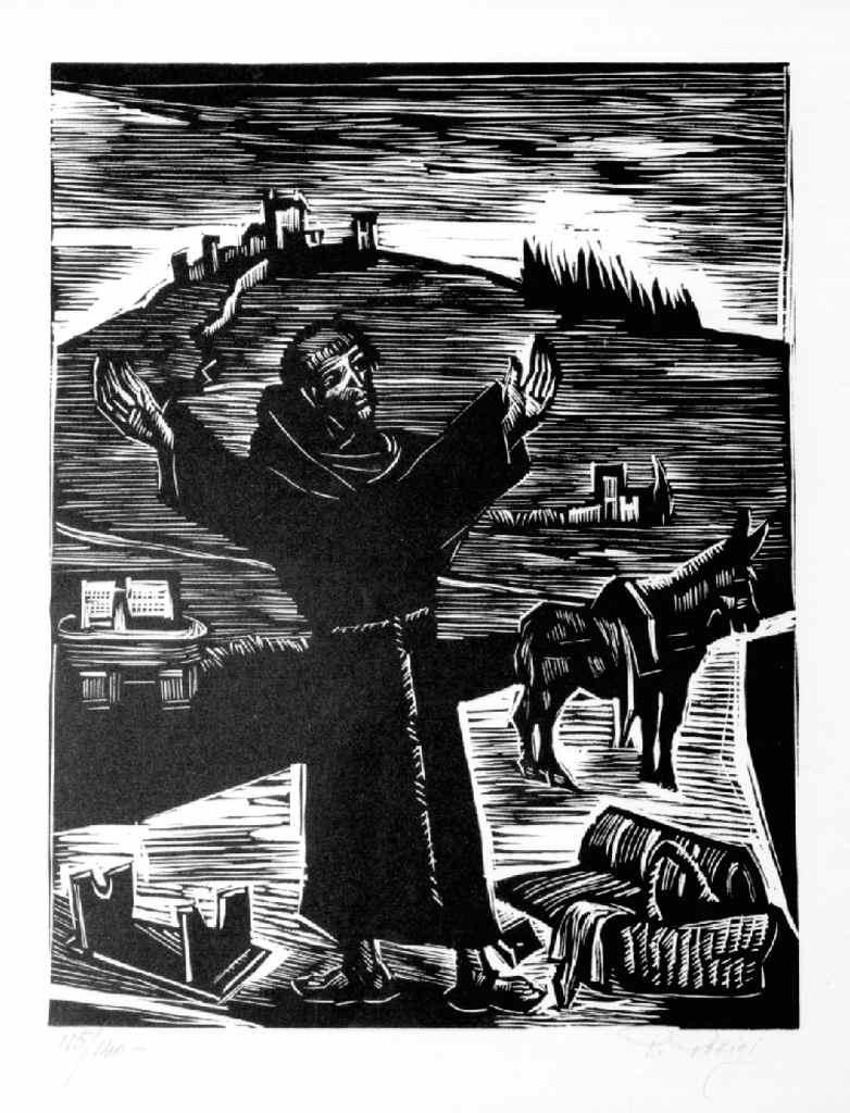 Personaggi: San Francesco. Abbigliamento religioso: saio. Animali: asino. Paesaggi. Oggetti: rotoli di stoffa