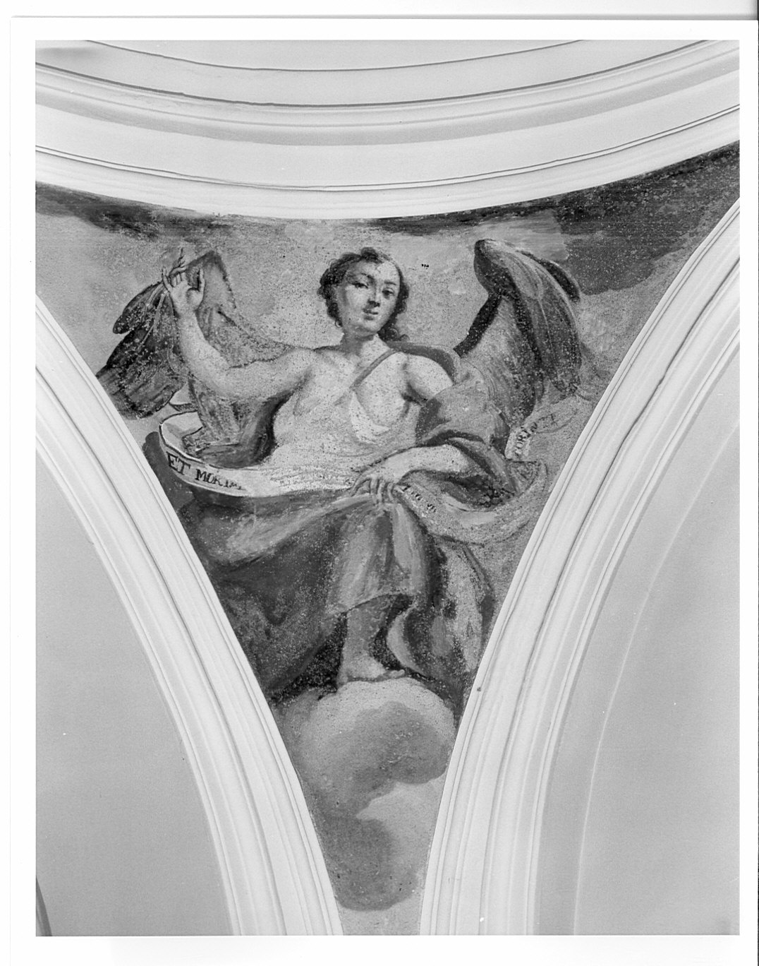 Affresco raffigurante un angelo in età giovanile con ali grigie e manto rosso.