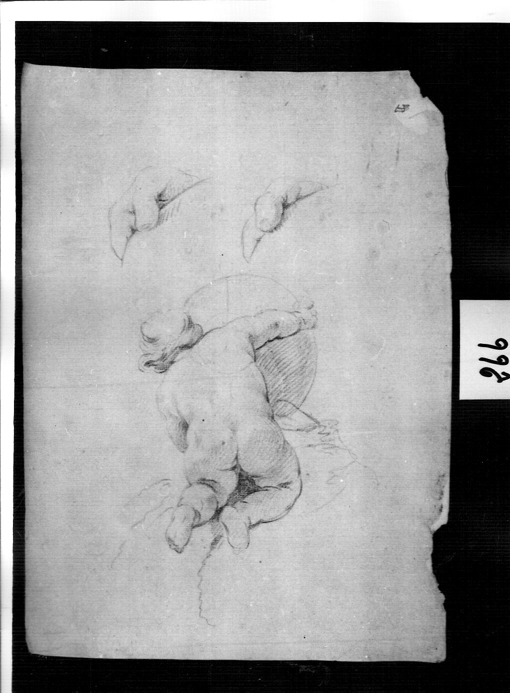 puttino di schiena e due particolari di mani, disegno, opera isolata