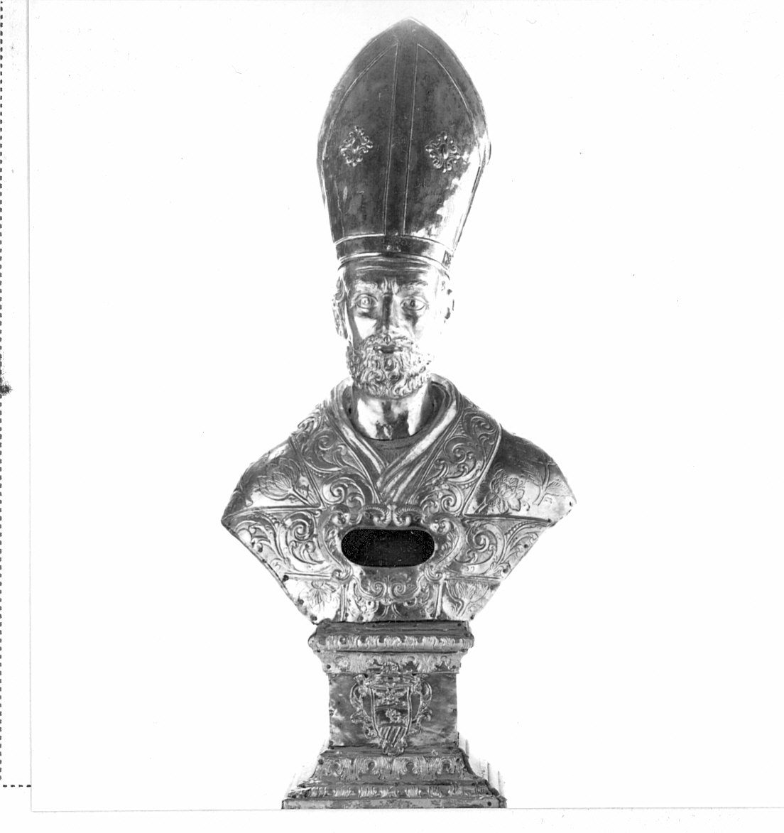 Busto raffigurante un santo vescovo con mitria e piviale, al centro del petto teca portareliquia. Sula base poligonale è applicato uno stemma nobiliare.