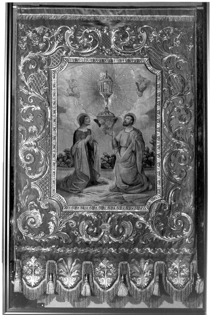 stendardo processionale della Confraternita del SS. Sacramento decorato al recto con SS. Sacramento e i SS. Nazaro e Celso, santi dedicatari della chiesa parrocchiale di Bellano, al verso Madonna del Rosario