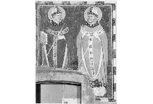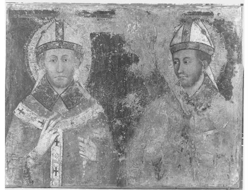 I due santi sono presentati a mezzo busto; l'uno, a sinistra in posizione frontale, indossa una veste rossa e accenna un gesto di benedizione con la mano destra, mentre con l'altra impugna il pastorale, il secondo, disposto leggermente di tre quarti verso il compagno, indossa una veste gialla.. Personaggi: santi vescovi. Abbigliamento religioso: abito episcopale