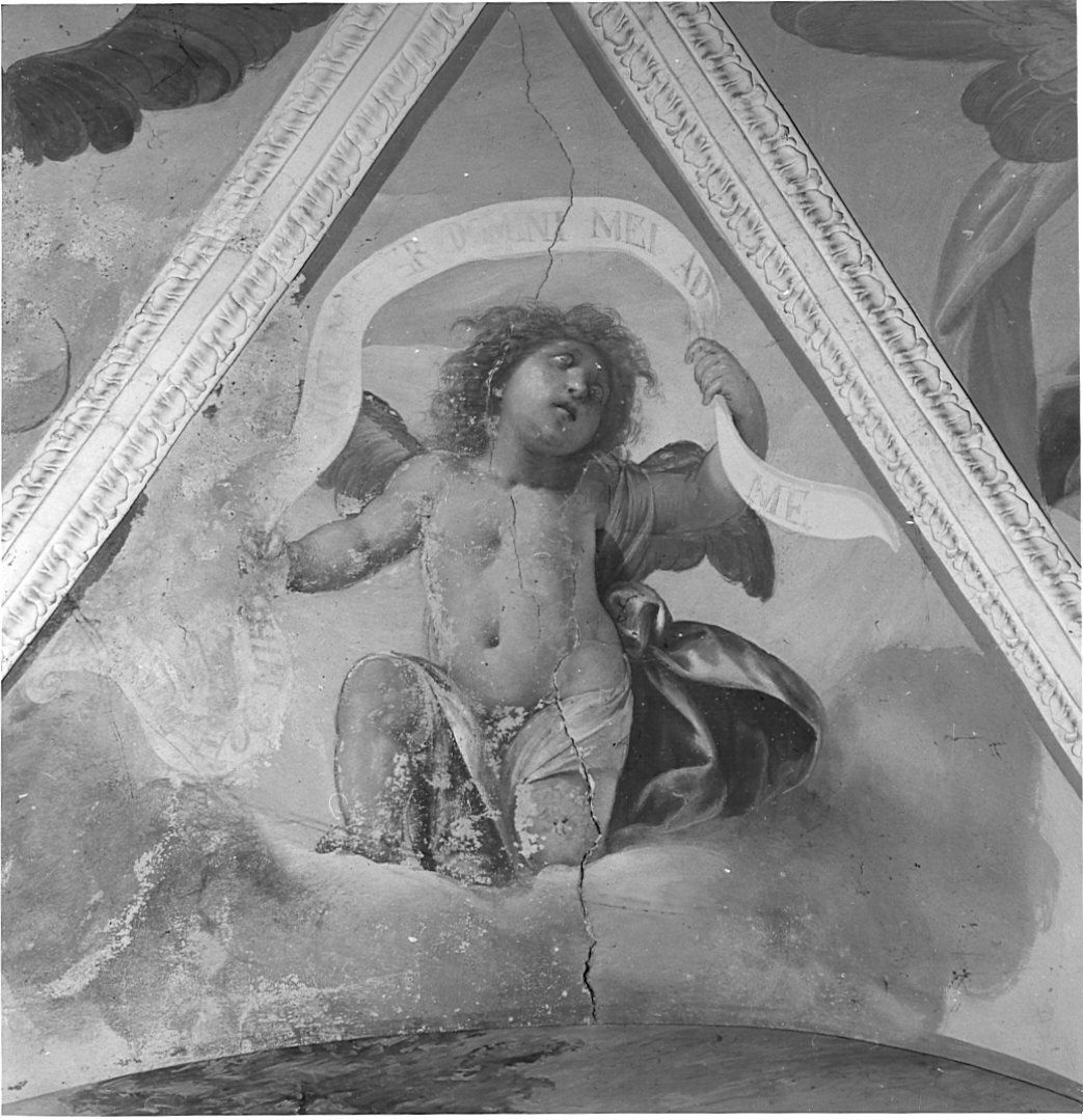 Affresco raffigurante un puttino alato con manto, inginocchiato sopra un cumulo di nubi. Regge tra le mani un cartiglio.. Figure: puttino alato