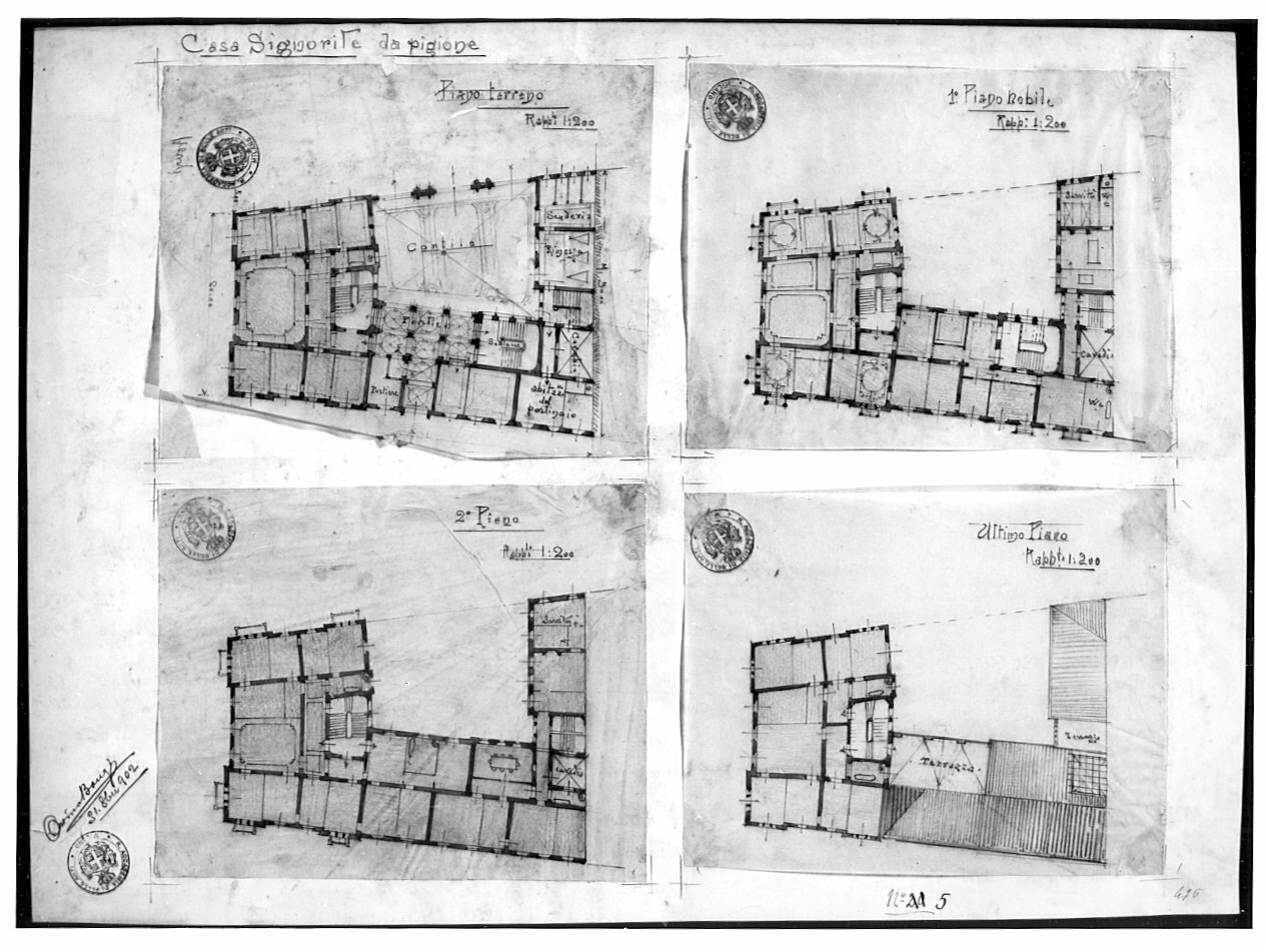 Serie di quattro piante a china, bistro e matita rossa e blu su carta da lucido incollata su cartoncino chiaro. Inferiore: pianta del secondo piano con soddivisione in tre appartamenti campiti in blu e rosso. Due scale d'eccesso indipendenti, vista dall'ultimo piano con terrazzi, coperture e due appartamenti. Superiori: pianta del piano terreno con appartamento, servizi di portineria, rimessa e scuderia, pianta del piano nobile con due scale d'accesso e appartamenti. Segnalati i progetti di decorazione dei soffitti.