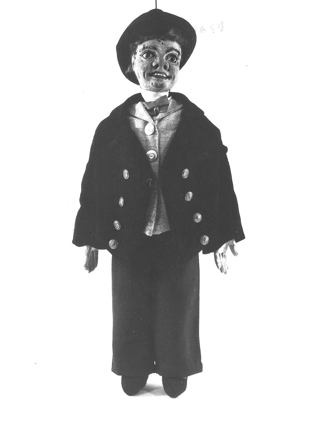 Marionetta con testa e mani di legno. Viso dipinto a tempera e ad olio