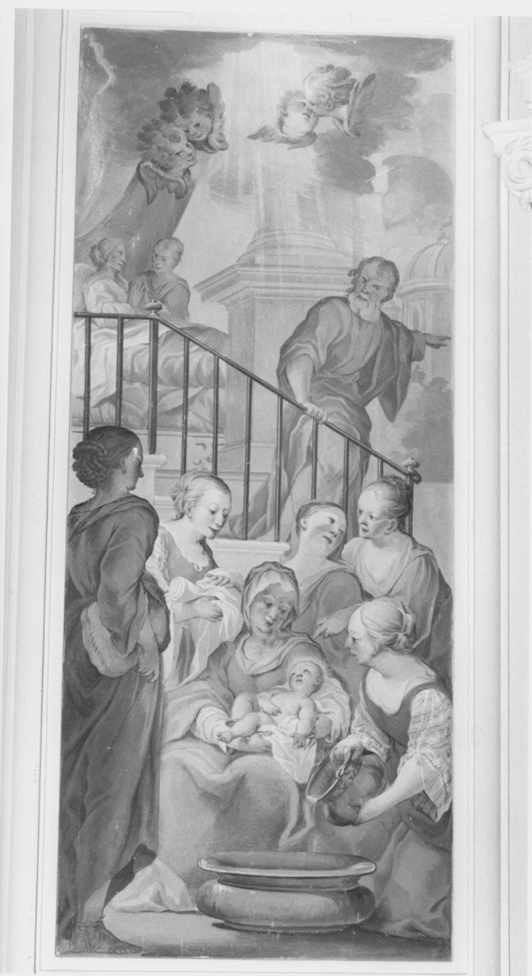 Nascita della Vegine.. Personaggi: Madonna; Sant'Anna. Figure: figure maschili; figure femminili; cherubini. Oggetti: bacinella; secchio; panni. Mobilia: letto. Elementi architettonici: colonna; basamento di colonna; scala. Architetture: cupola. Fenomeni naturali: luce