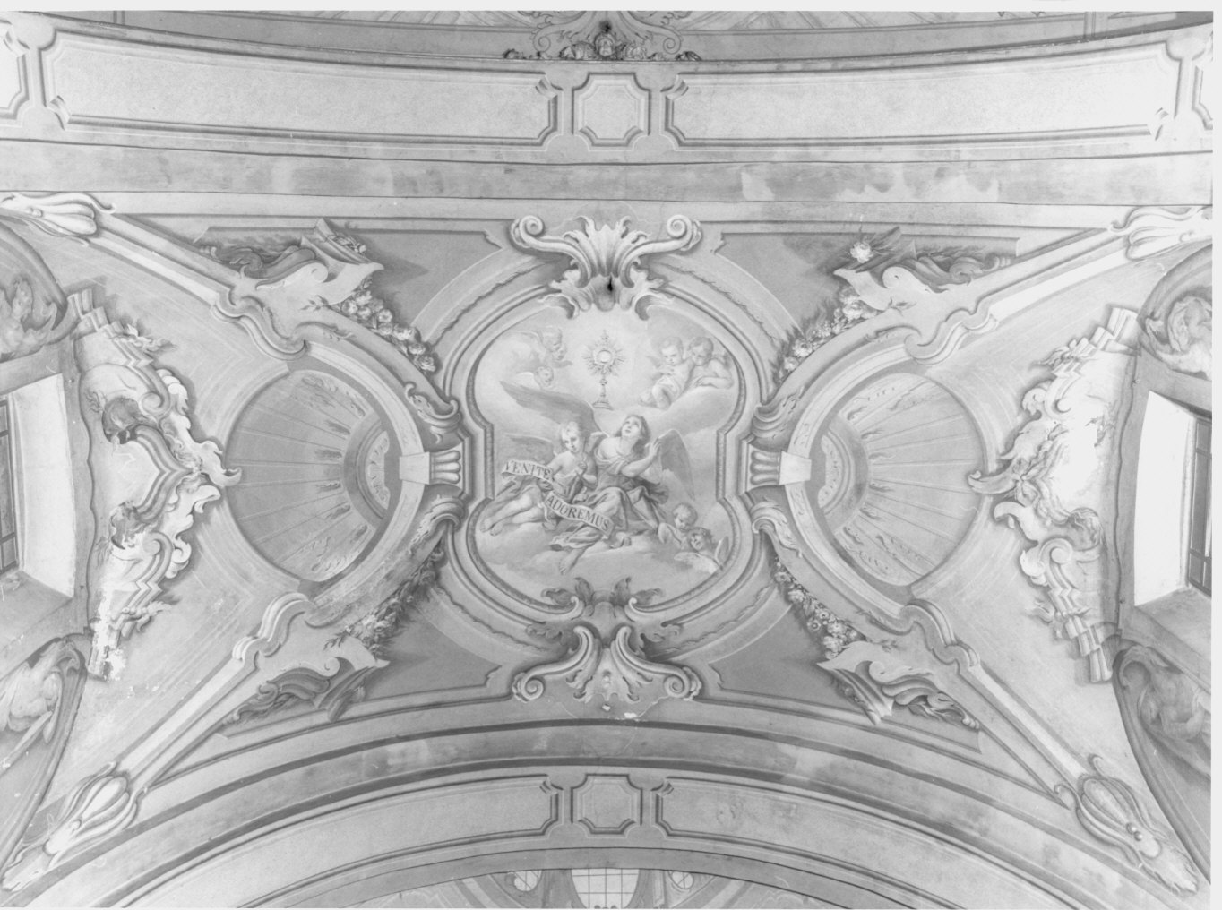 Le architetture illusionistiche fingono delle cornici e delle vele terminanti con un catino.. Figure: angeli; cherubini. Attributi: (Santissimo) ostensorio. Architetture fantastiche