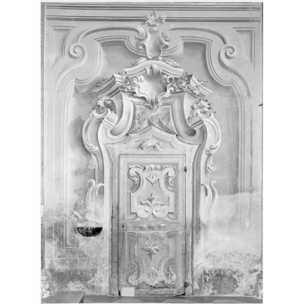 Le decorazioni che riquadrano le due porte in legno dipinto fingono due fastigi a volute sfrangiate con cartella cieca centrale. Dal cornicione curvilineo spezzato ricadono mazzi di rose variopinte.