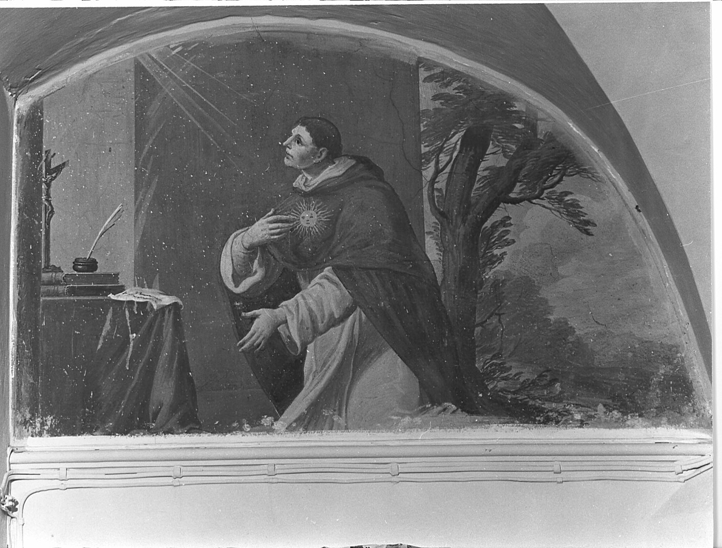 Dipinto murale raffigurante il santo dinnanzi a un tavolo con crocifisso, mentre indica con la mano destra il sole sul suo petto. Sul tavolo sono appoggiati volumi e una penna d'oca.. Personaggi: Sant'Tommaso d'Aquino