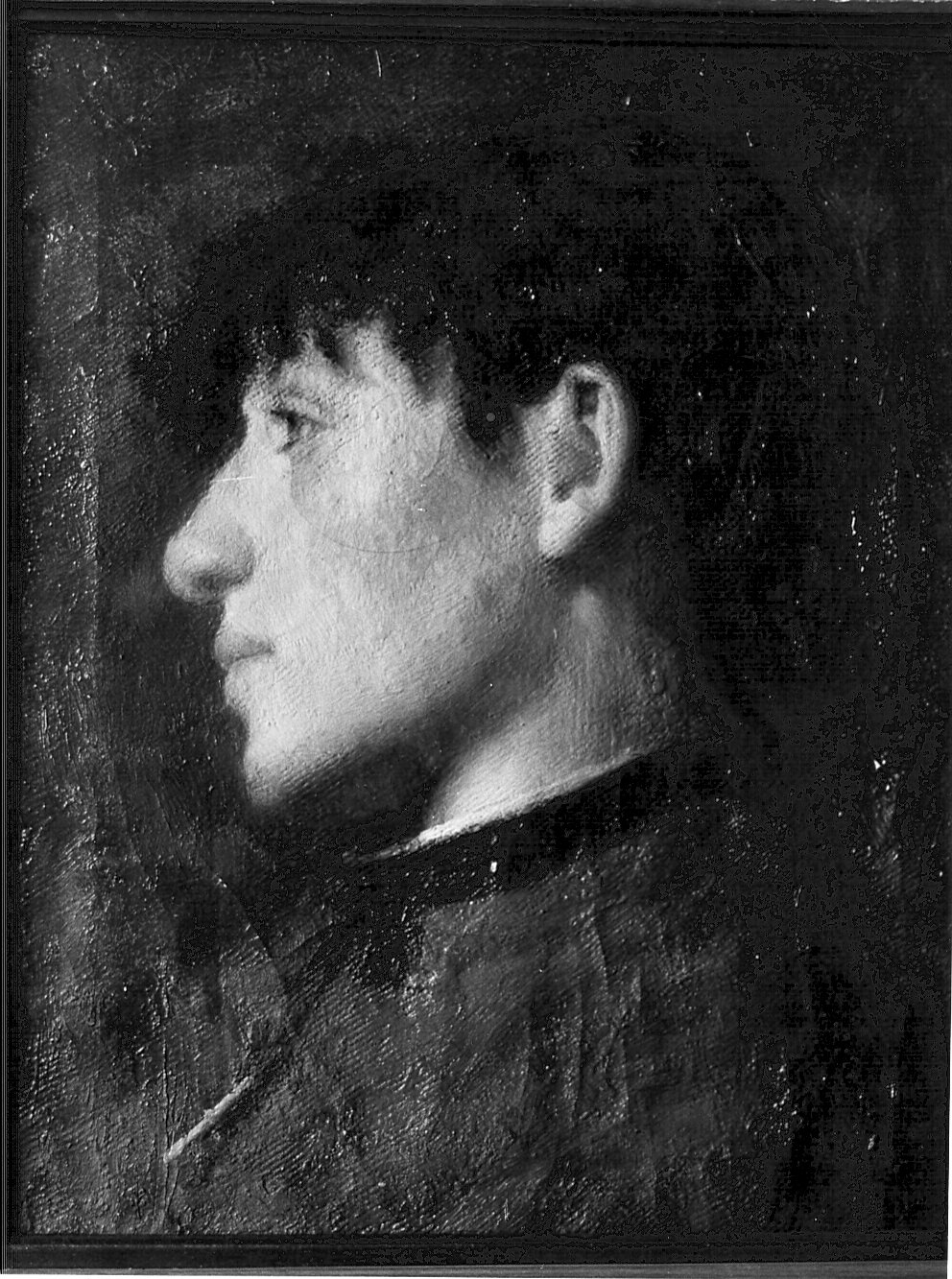 Fondo bruno. Veste in verde oliva cupo con orlo nero al collo. CApelli neri. Volto internamente illuminato dal colorito rossastro, labbra rosse. Nessuna sigla visibile. Cornice moderna.