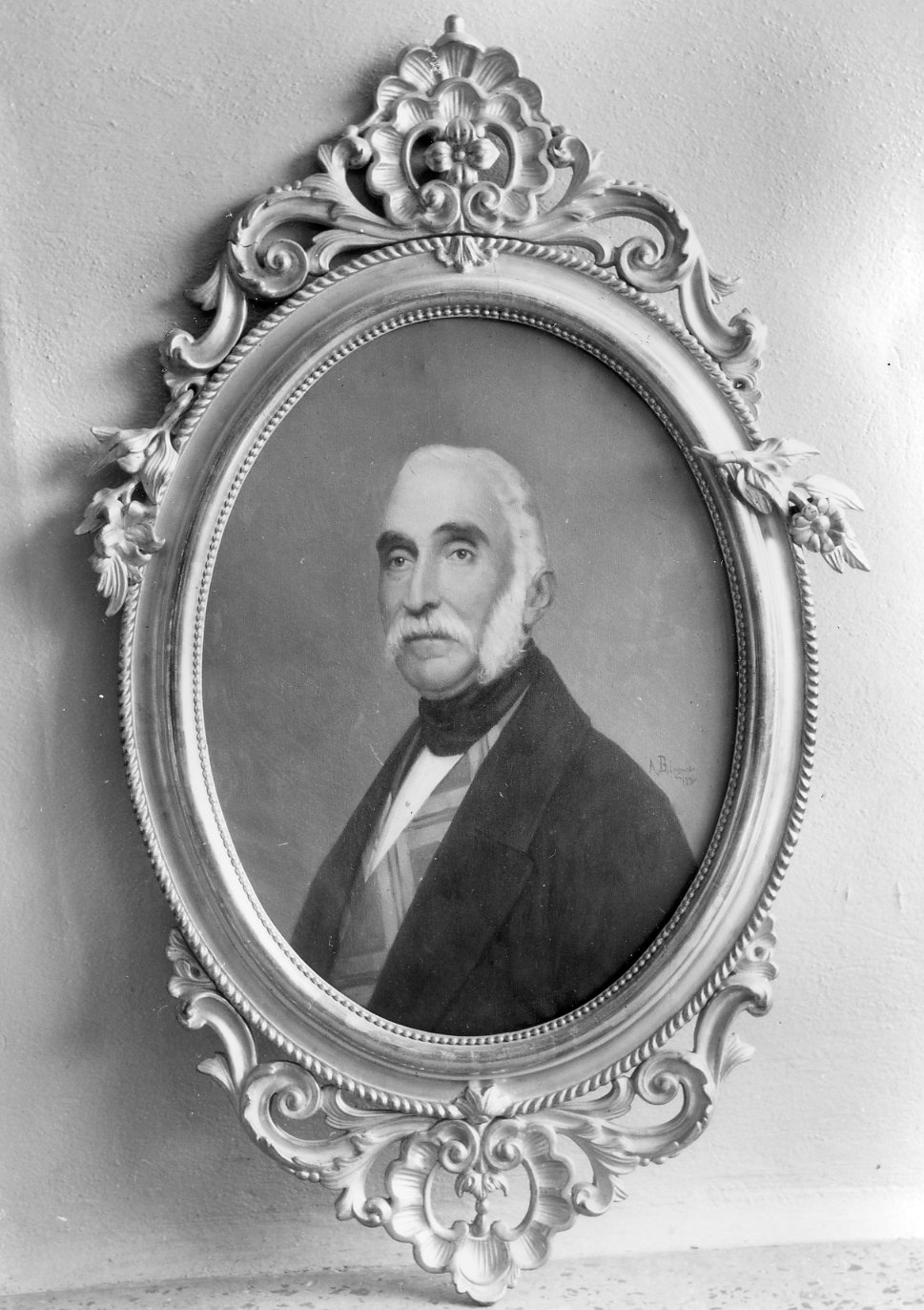 Mezzo busto volto di 3/4 verso sinistra; il capo è scoperto, i capelli, baffi e favoriti bianchi; indossa giacca nera su panciotto a righe bianco azzurre. Entro una cornice lignea ovale (cm. 100x60), con gola liscia e bordo esterno a cordone; in basso e in alto decorazione applicata intagliata a giorno con fiori, foglie e volute, dorata.