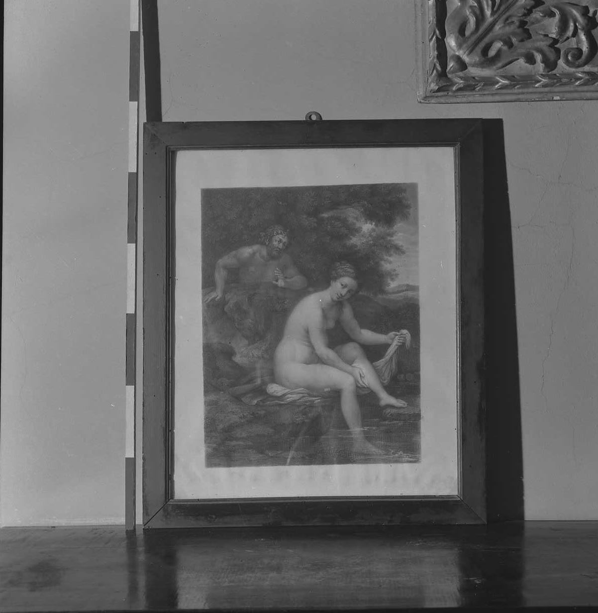 La donna nuda è nell'atto di asciugarsi, seduta sulla sponda di una gora d'acqua, con un piede ancora immerso. Dalla roccia retrostante protetta da alberi sbuca un nerboruto satiro dal capo coronato di fronde.