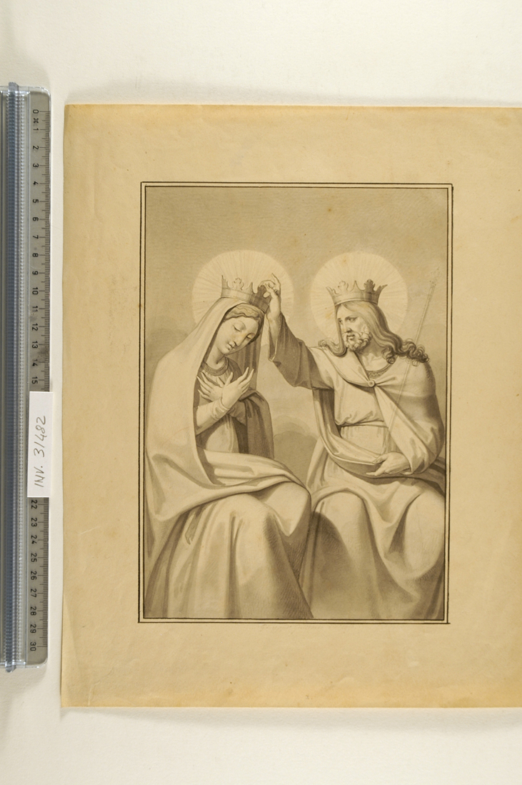 Entro una doppia cornicetta tracciata a penna e inchiostro nero sono la Madonna, seduta a sinistra, le braccia al petto e la testa chinata, mentre viene incoronata da Cristo seduto a destra. A matita nera e acquerellatura grigia su carta forse avorio, fortemente ingiallita.. Personaggi: Cristo; Madonna. Attributi: (Cristo) scettro. Soggetti sacri: incoronazione di Maria Vergine