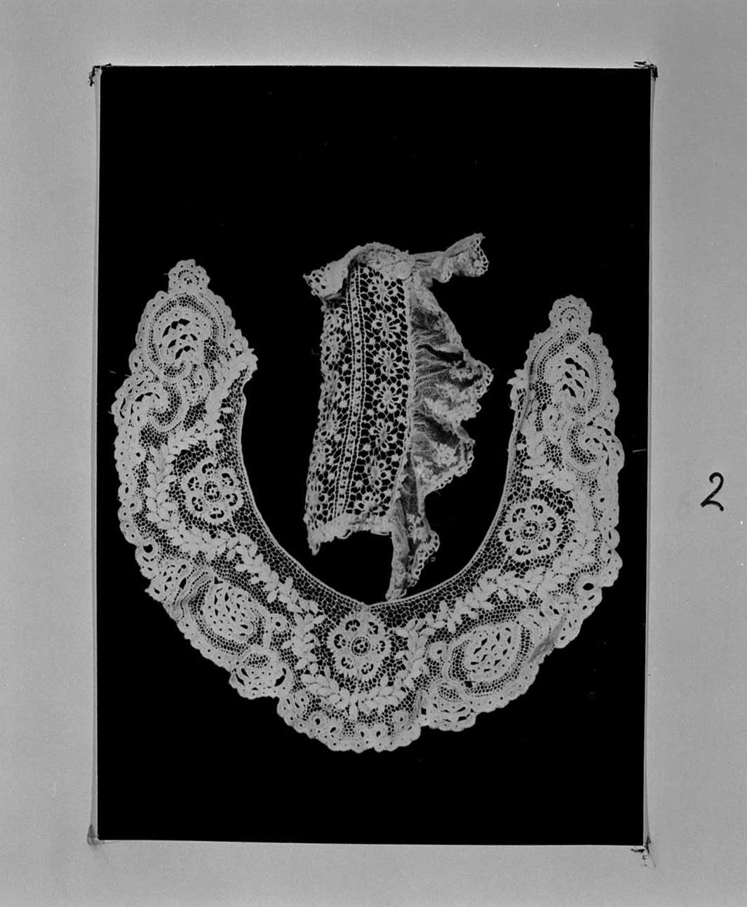 Colletto e polsino. Colletto di trina eseguita a macchina, a orlo a lieve festone e fitta decorazione di steli continui e ondulati, fiori stilizzati a motivi geometrici. Polsino con doppia fascia di trina traforata a simmetrici fiorellini, seguita da bordo di tulle festonato con fiorellini sparsi.