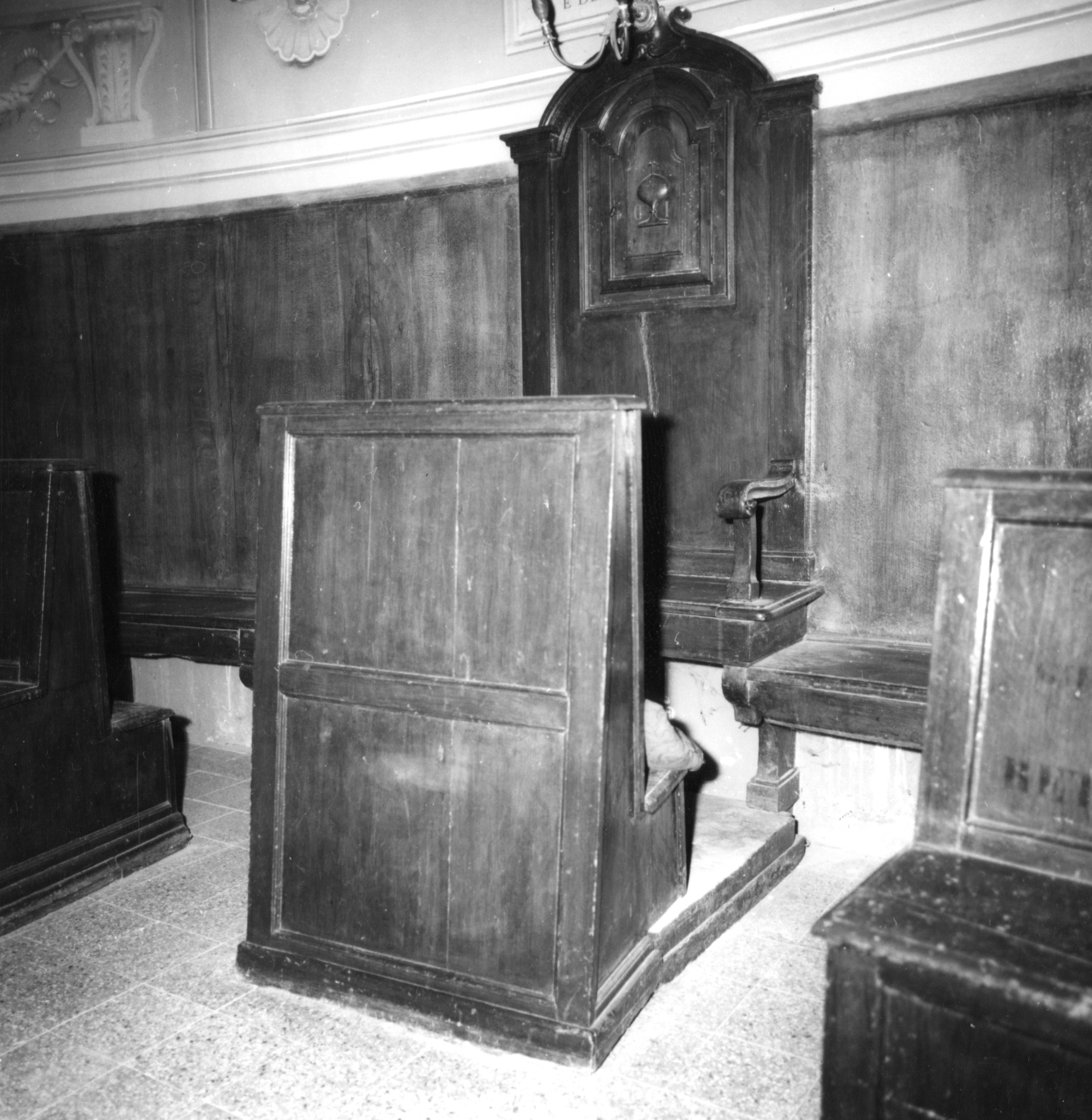 Sullo sportello è intagliata una pisside e si nota l'iscrizione "O.I.". La nicchia è inserita nella sedia del priore.