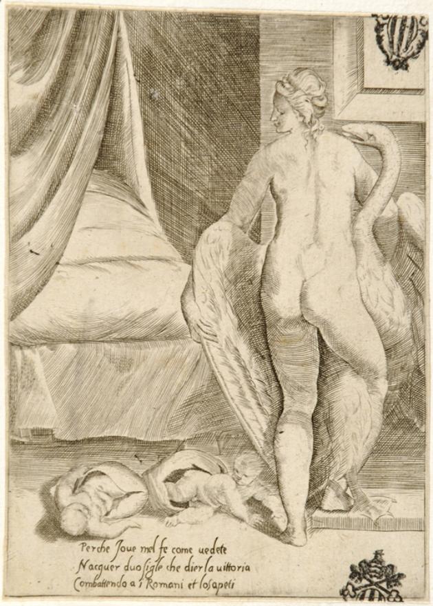 Divinità: Giove. Personaggi: Leda. Figure: bambini. Interno. Mobilia: letto. Metamorfosi: Giove/ cigno