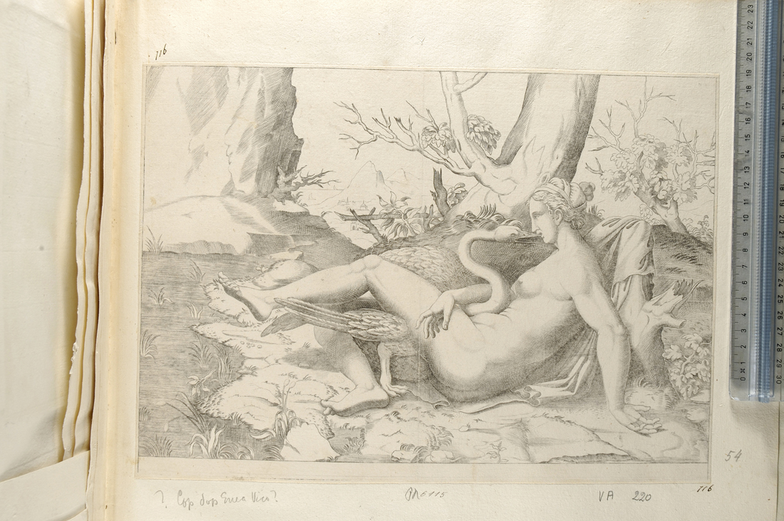 Personaggi: Leda; Giove/ cigno. Paesaggi: paesaggio fluviale