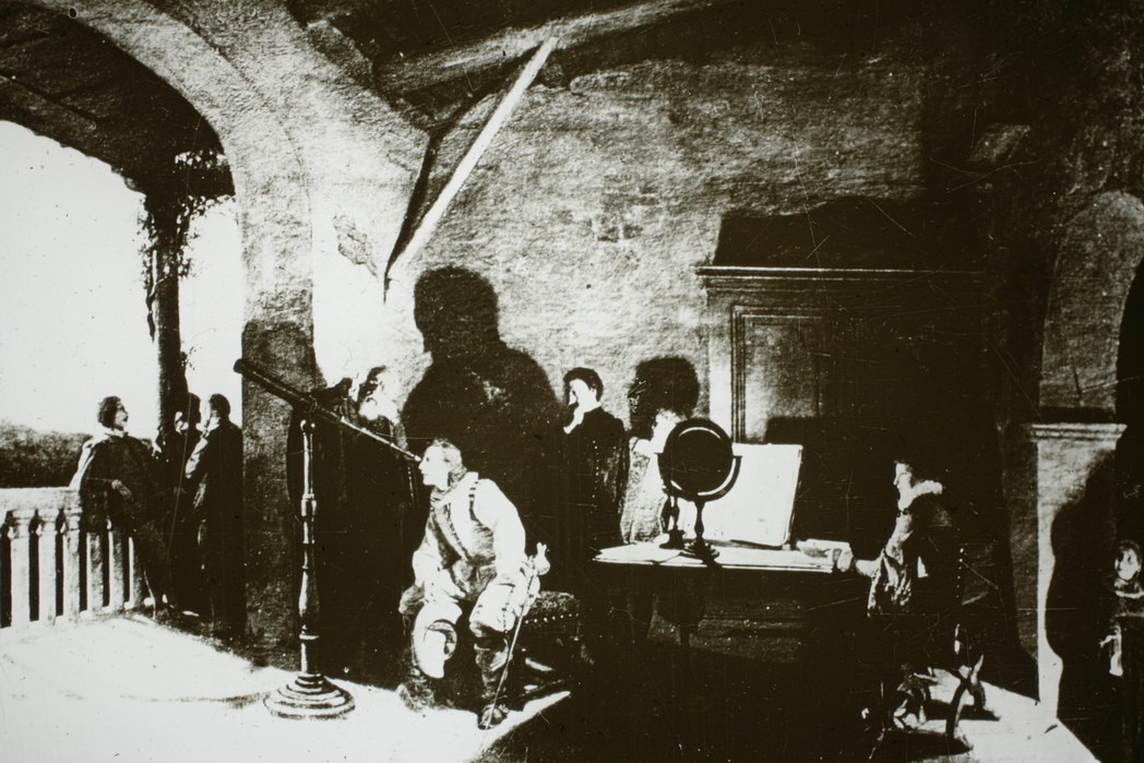 Disegno raffigurante Galileo Galilei al telescopio; Disegni - Galileo Galilei (diapositiva)