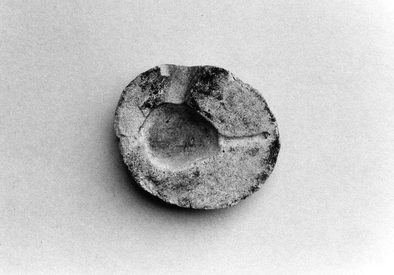 Valva ovoidale con decorazione in negativo a forma di pera, peduncolo e foro di colaggio. Sul bordo laterale è inciso un segno d'innesto della matrice composto da mezza X.. Vegetali: frutto
