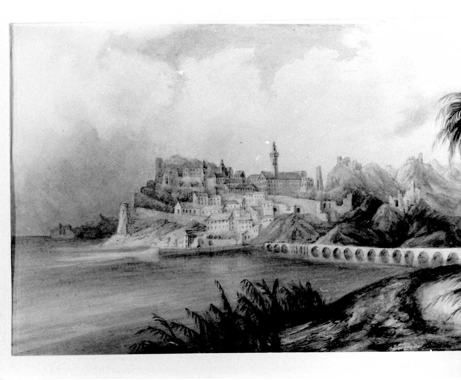 FOGLIO INSERITO ENTRO CORNICE LIGNEA E PASSEPARTOUTIMMAGINE PRESA DALLA FOCE DEL ROIA; SI DISTINGUONO IL PONTE CHE ATTRAVERSA IL FIUME E POI, DA SINISTRA, LA PORTA MARINA, IL CAMPANILE DELL'ORATORIO DI SAN GIOVANNI, IL CAMPANILE DELLA CATTEDRALE CHE SPUNTA DIETRO AL SEMINARIO; INFIN, SEPARATA DAL RESTO DEL NUCLEO URBANO, SAN MICHELE. SULLE ALTURE IN SECONDO PIANO, FORTE SAN PAOLO E CASTEL D'APPIO. Vedute: Ventimiglia