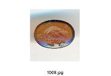 Agata zonata arancione, marrone, nera e bianca. Forma ellittica; Zwierlein-Diehl 8. Aquila ad ali spiegate di tre quarti verso d., con ricco piumaggio. Linea di base.