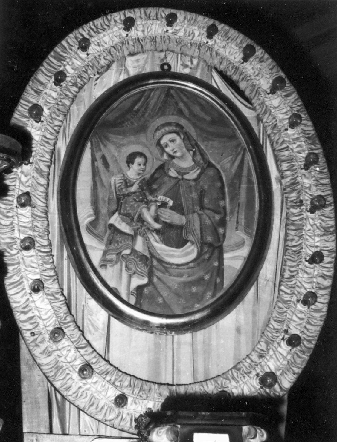 L'affresco trasportato su tela ha forma ovale. Raffigura la Madonna seduta su trono dal fondo panneggiato di rosso. Indossa veste rossa con manto azzurro a fiori stellati dorati. Sulle ginocchia è il Bambino benedicente in veste rosata arabescata. Cornice ovale in legno dorato.