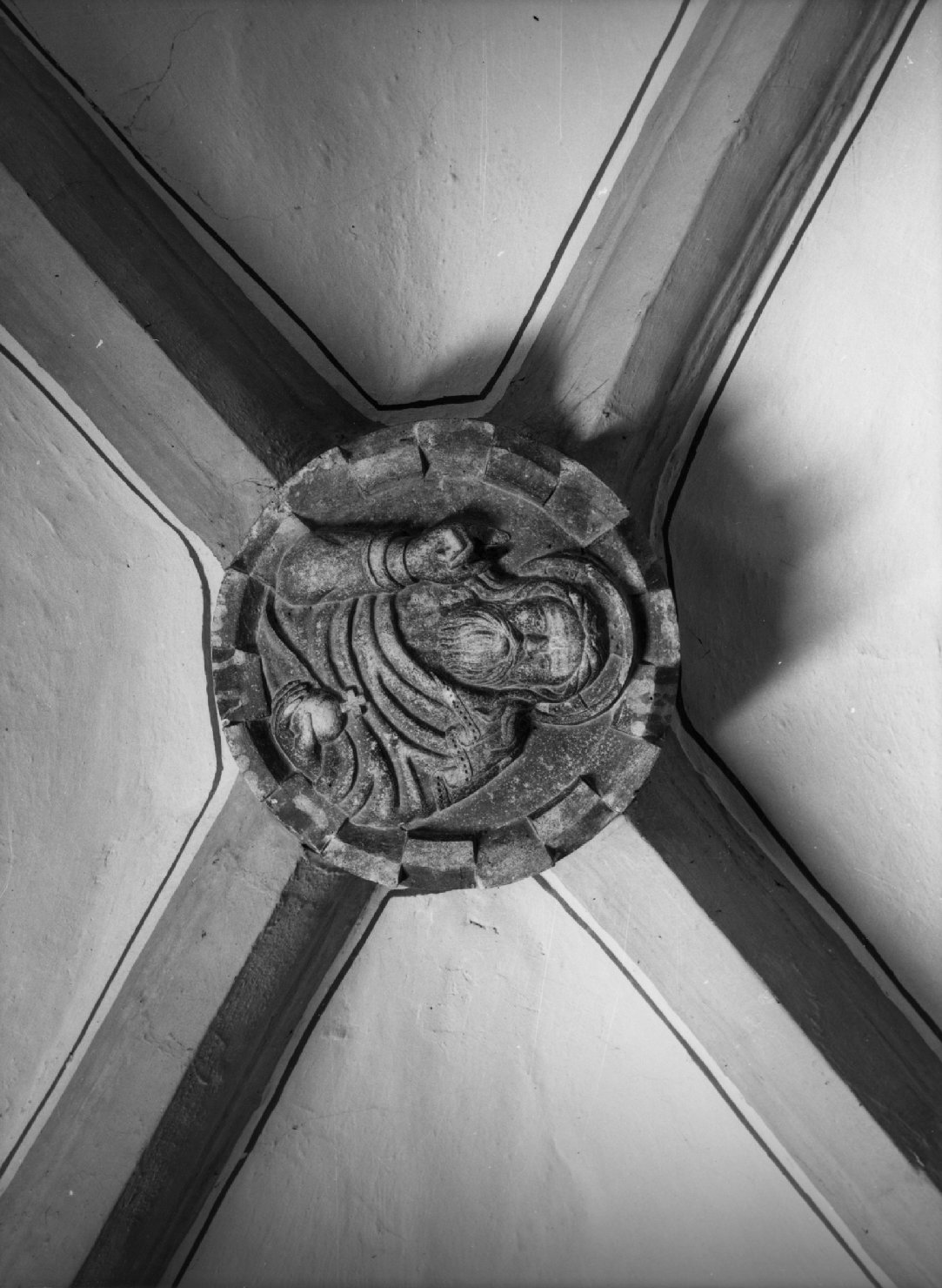 Tondo con cornice a dentelli. Al centro la mezza figura di Dio.. Personaggi: Dio Padre. Attributi: (Dio Padre) globo crucifero