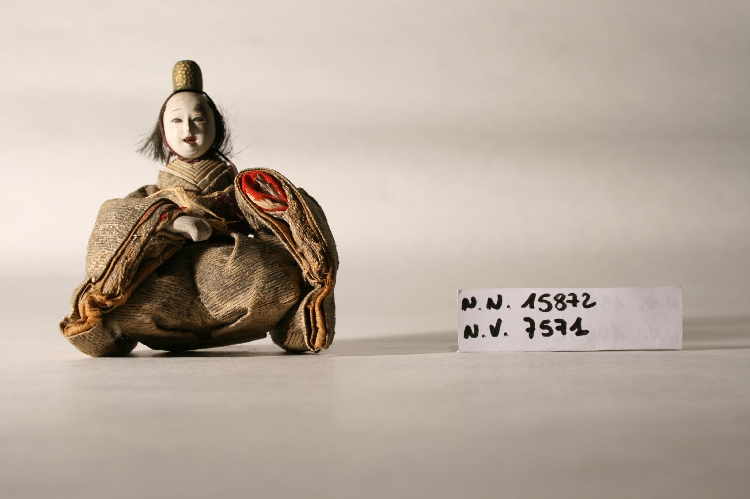 Piccola bambola rappresentante un funzionario di corte giapponese con copricapo in metallo ed abito in seta; sul collo dell'abito sono presenti sette pieghe ad indicare le sette sottovesti tipiche dell'abigliamento nobiliare; il viso è in porcellana dipinta.