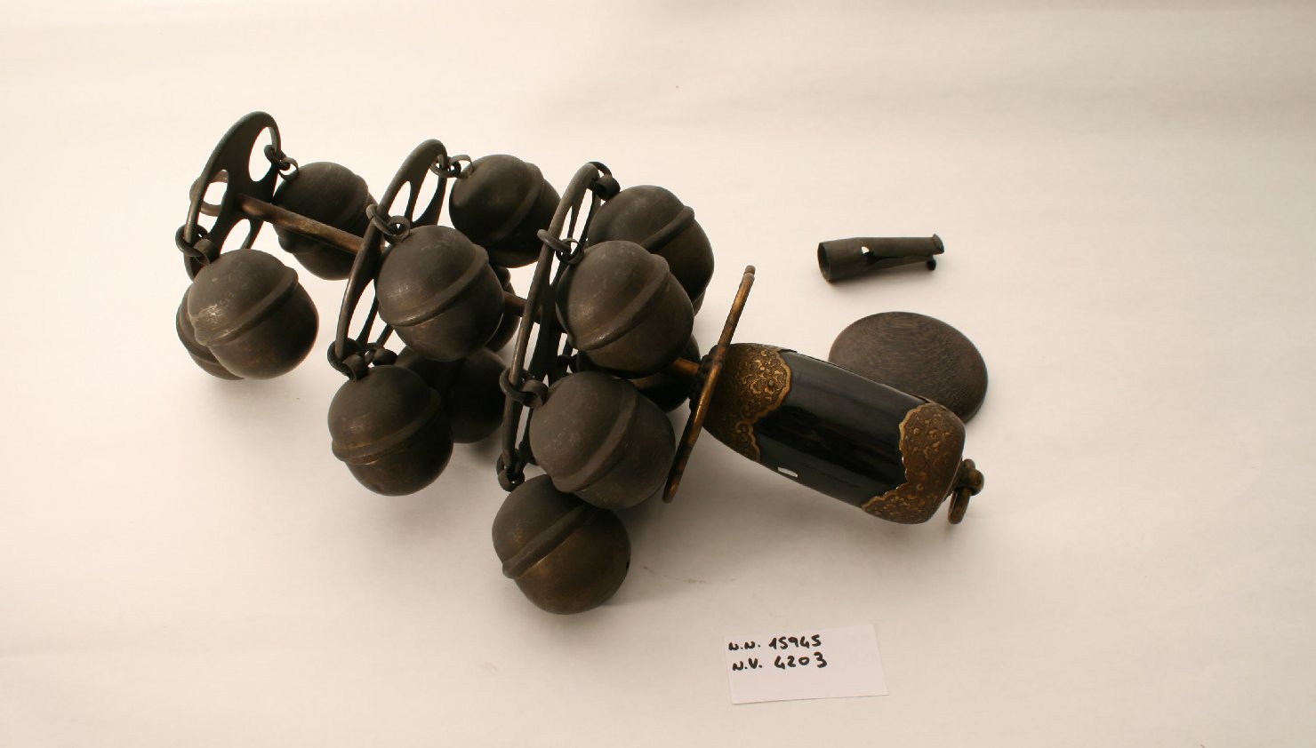 Sonaglio buddhista con manico laccato nero e rinforzato da piastrine in rame dorato; presenta tre ordini di piccoli campanelli sferici per un totale di quattordici campanelli.