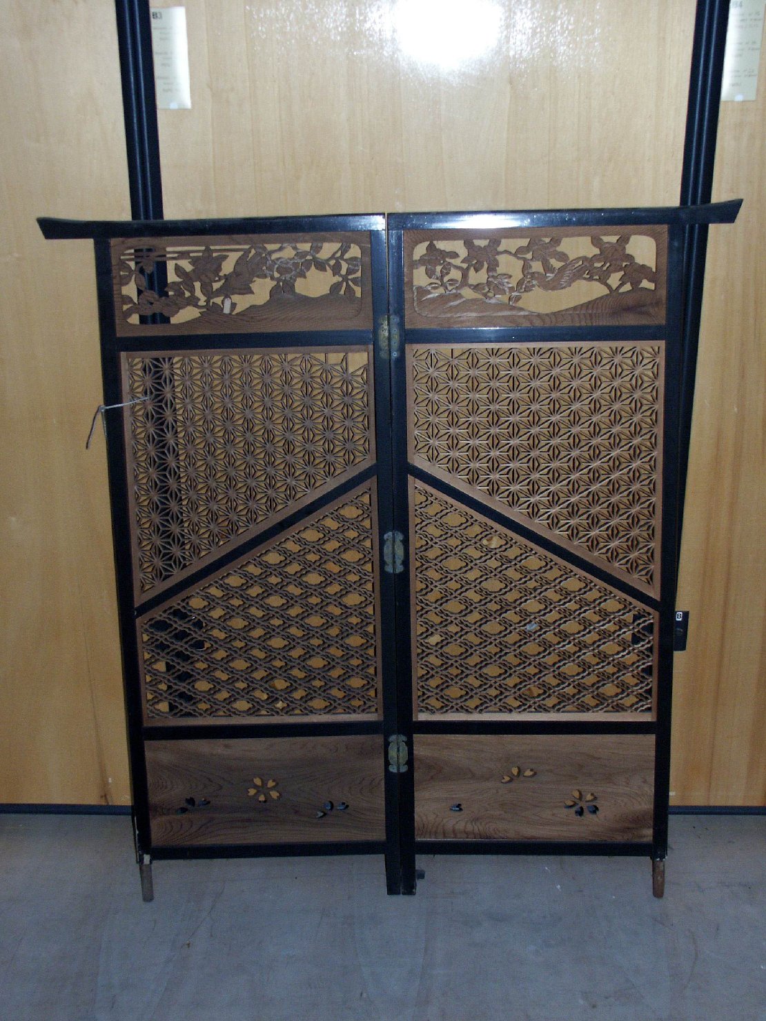 Paravento a due ante in legno lavorato a traforo, con immagine di uccello fra rami di peonia fioriti, motivi geometrici ed a nuvola nella parte centrale.