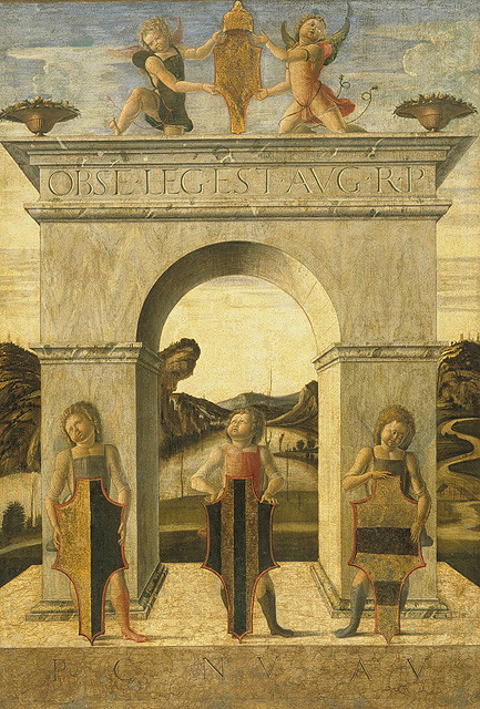 Figure: putti reggistemmi. Oggetti: stemmi. Architetture: arco