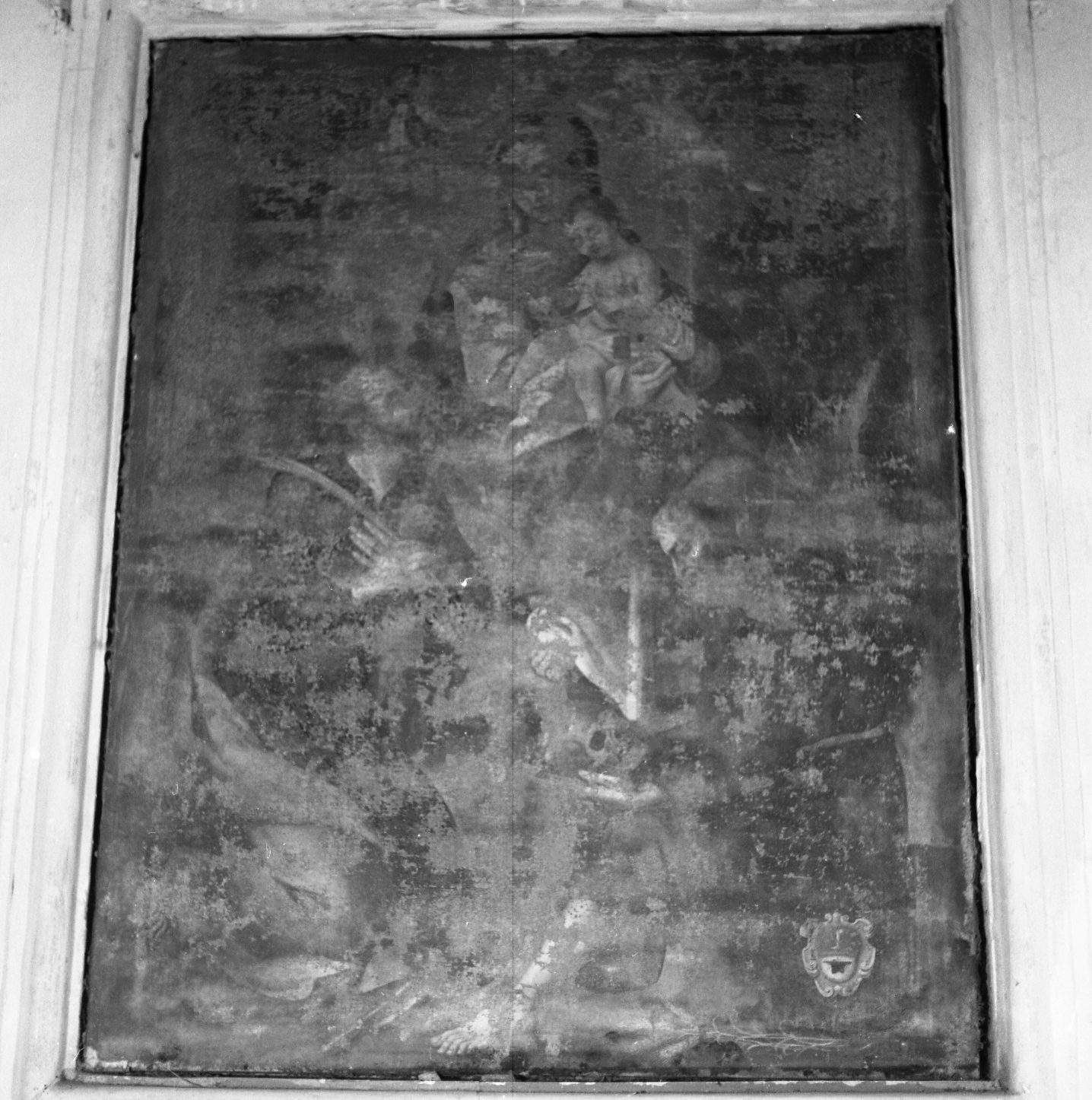 Al centro è la Madonna in trono col Bambino sulle ginocchia; a sinistra, S. Bartolomeo e a destra, S. Girolamo sono inginocchiati davanti alla Vergine. In basso a sinistra, uno stemma nobiliare bipartito. Policromia fondo marrone, vesti blu. rosso e bianco.