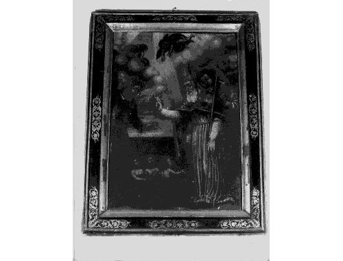 A destra, santo con veste bianca e mantello marrone, in piedi, nell'atto di benedire tre bambini. Intorno al Santo tre figure; in alto un angelo. Cornice in legno dorato e dipinto in nero con fregi dorati.