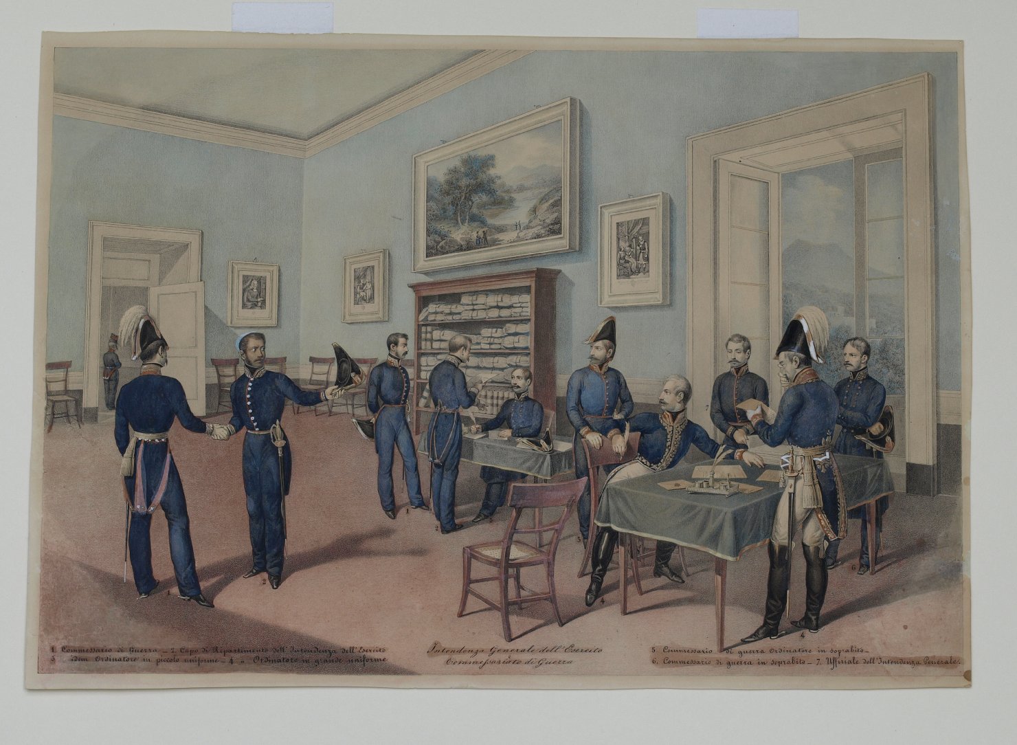 Figure maschili. Abbigliamento: militare. Decorazioni. Oggetti: mobilia; quadri; libri. Interno