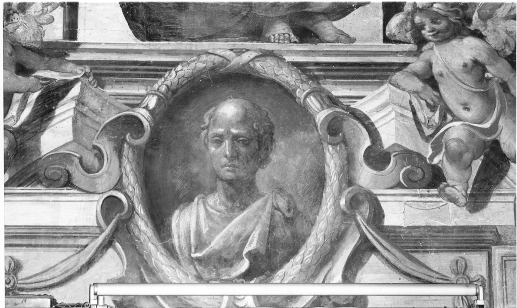 Il busto maschile è raffigurato frontalmente entro una finta nicchia dipinta con una cornice afogliame e quattro volute. L'insieme è realizzato sui toni del giallo oro.. Personaggi: Lucullo. Elementi architettonici: nicchia; timpano spezzato