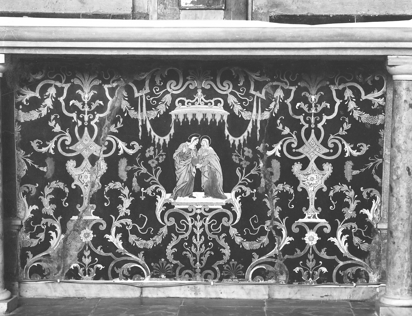 Sul fondo nero si sviluppa un gioco simmetrico di racemi azzurri, rosa e verdastri che fa da cornice alla scena centrale con la Visitazione al di sopra della quale è posta una corona.