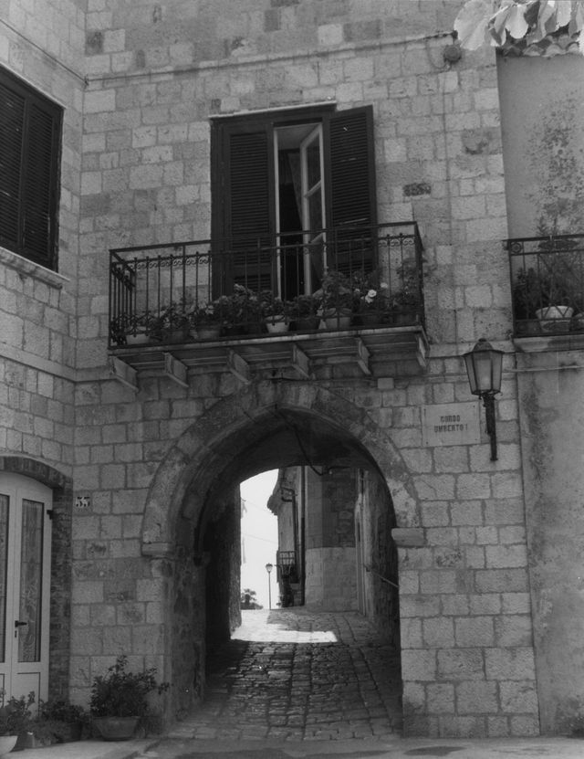 Porta urbica con arco ad ogiva, rinfianco laterale in muratura in pietra squadrata a vista, caratterizzata da mensoline alle reni. Il passaggio è sormontato da una volta a botte ribassata. La porta, sormontata su Via Umberto I da un balcone poggiante su travi in ferro, è inglobata in un edificio per abitazione