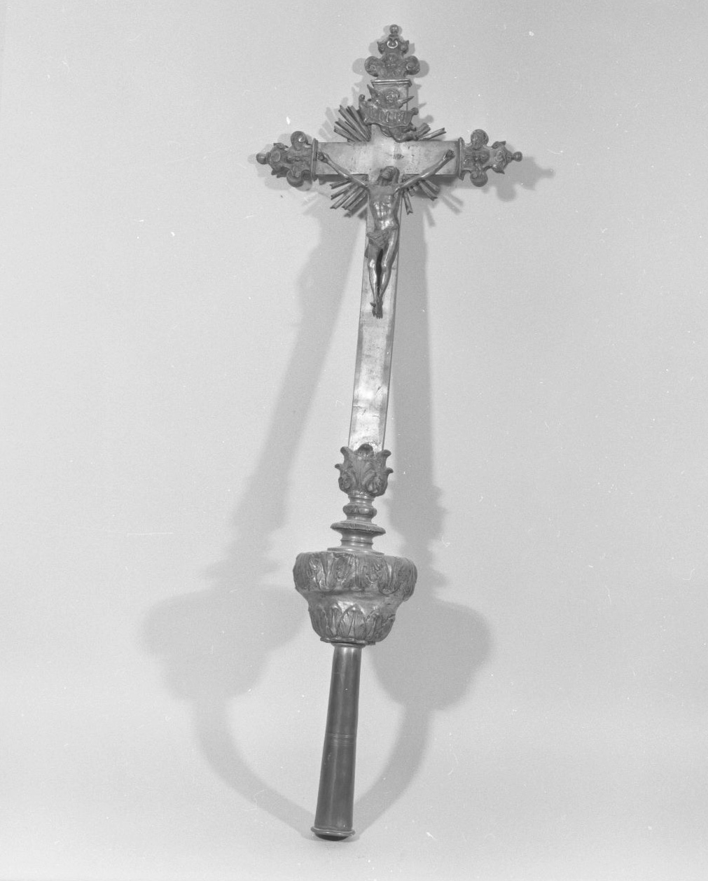 Croce portatile provvista, in basso, di manico dalla forma affusolata. Sopra di esso un corpo rotondeggiante ed ornato con foglie e palmette stilizzate funge da base per un piccolo piedistallo con due strozzature su cui, quasi uscendo da un cesto di foglie, si erge la croce con le estremità variamente intagliate con volute ed anse che inquadrano al centro la testa di un angioletto. Al centro, dal Cristo crocifisso che china il capo sulla spalla sinistra, emana un fascio di raggi dorati. In alto il titolo è sorretto da un altro piccolo angioletto in volo.. Personaggi: Cristo corcifisso