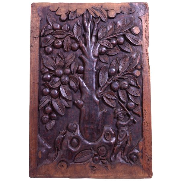 uomo intento a raccoglier frutti da un albero aiutandosi con un bastone, un roditore