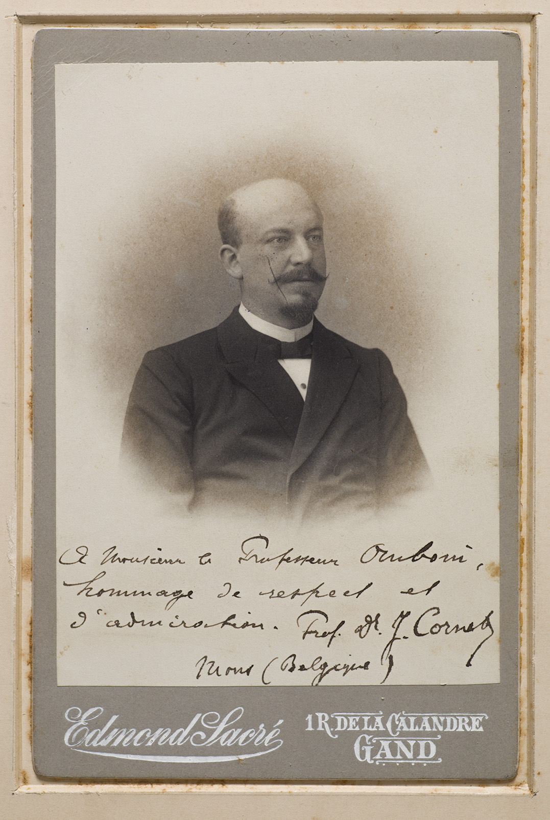 1 fotografia : platinotipo ; 106 x 164 mm. Nota manoscritta sul recto: A Monsieur le Professeur Omboni, hommage de respect et d'admiration. Prof. Dr. J. Cornet. Mons (Belgique).Cornet Jules: http://fr.wikipedia.org/wiki/Jules_Cornet.Fa parte di: https://phaidra.cab.unipd.it/detail_object/o:47294
