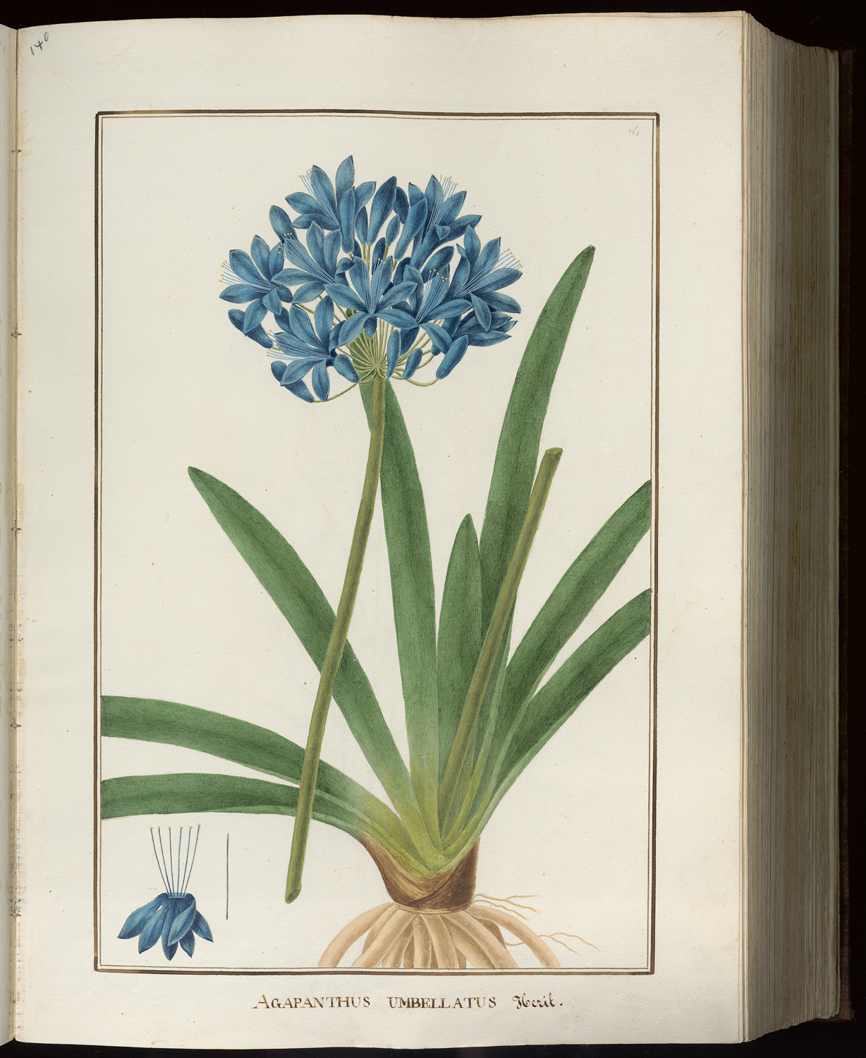 Tavola tratta da: Piante del R. Orto di Padova Agapanthus umbellatus Herit. (Agapanthus umbellatus L'Herit.) Liliaceae (Alliaceae) agapanto È una pianta fornita di rizomi, obliqui e tuberosi, con abbondanti radici avventizie carnose. Da essi si dipartono numerose foglie nastriformi, piane, lisce, ricadenti nella parte superiore, d'un bel colore verde intenso. La pianta si può considerare sempreverde perché in buone condizioni di coltivazione - e in Italia si trova solo coltivata - mantiene le foglie praticamente tutto l'anno. Dal robusto cespo di foglie, nel bel mezzo dell'estate, si innalza uno scapo robusto alto parecchi decimetri, liscio e nudo, che porta un'ombrella ricca di qualche decina di fiori. Dalla regione del Capo di Buona Speranza l'Agapanto è arrivato in Europa sul finire del XVII secolo, ma le date documentate della sua presenza in Italia sono posteriori di almeno un secolo. La letteratura finora dava come prima data di coltivazione in Italia, a Firenze, il 1796. Ora invece la presenza di questa pianta, sotto il nome di Crinum africanum, anche nella collezione Stirpium imagines [.,.], della Oak Spring Garden Library (Rachel Mellon Collection) a Upperville (Virginia), ci testimonia che la pianta era coltivata nell'Orto botanico di Padova già nel 1776.