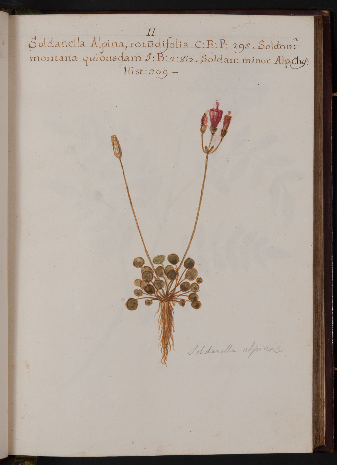 Tavola tratta dal primo volume del manoscritto cartaceo in due volumi Labore et studio Zannichelliano plantarum Montis Caballis ad vivum delineatarum}, comprendente in tutto 170 tavole disegnate e colorate a mano rappresentanti le piante raccolte da Gian Girolamo Zannichelli sul Monte Cavallo (m 2250, Alpi Cadorine Orientali). Questo volume contiene 88 tavole che ritraggono 100 specie, l’introduzione e l’indice. In alto, nome secondo la classificazione bahuiniano-tournefortiana, in basso, a matita, classificazione linneana aggiunta da P.A. Saccardo. Legatura originale in pelle incisa in oro su cartone pressato. Introduzione e indice delle piante rappresentate sono ripresi in Joannis Hieronymi Zanichelli opuscula botanica posthuma...}, pubblicati nel 1730 dal figlio Gian Jacopo Zannichelli, consultabile nel sito della Österreichische Nationalbibliothek https://data.onb.ac.at/ABO/%2BZ184479905.