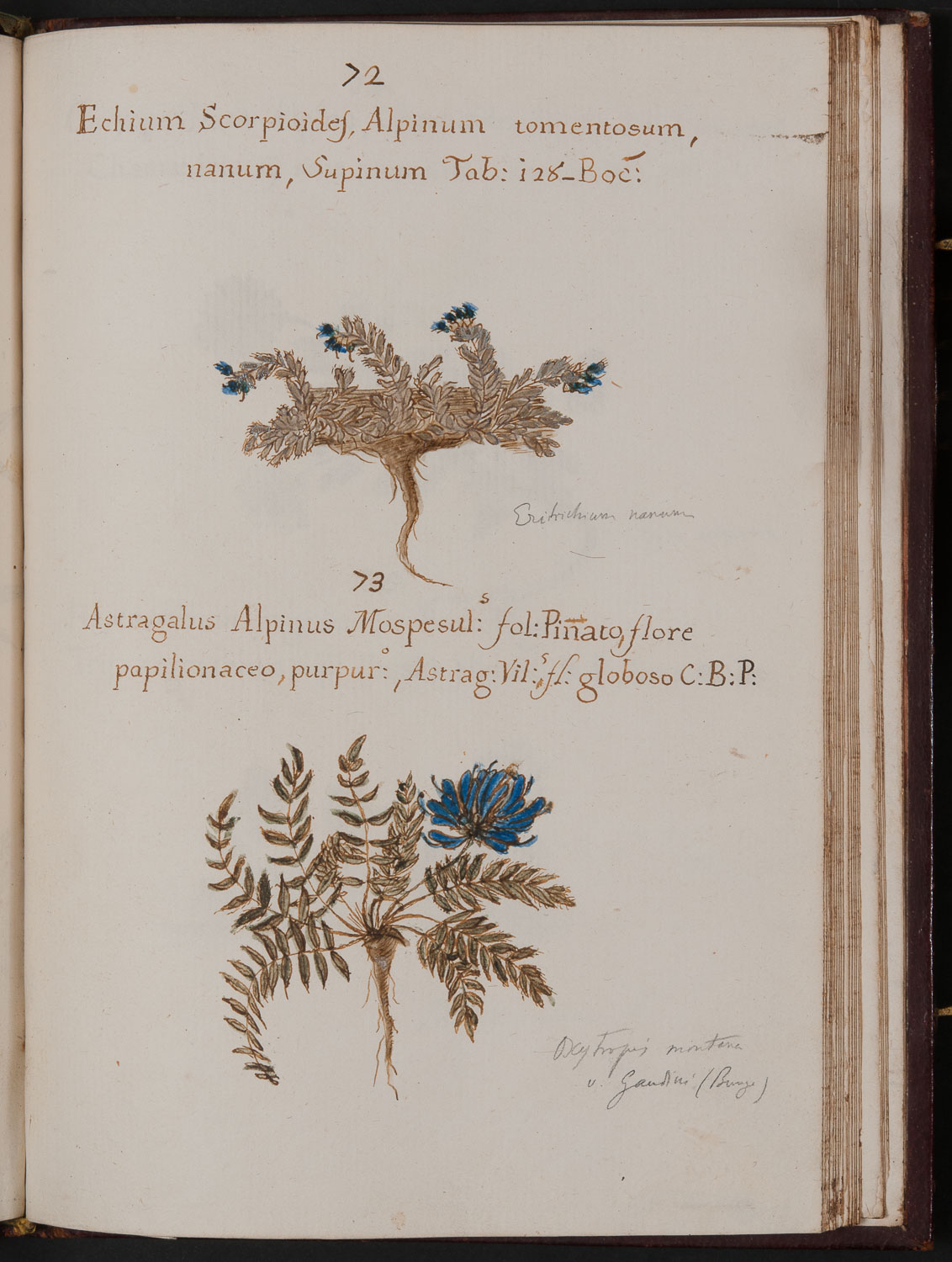 Tavola tratta dal primo volume del manoscritto cartaceo in due volumi Labore et studio Zannichelliano plantarum Montis Caballis ad vivum delineatarum}, comprendente in tutto 170 tavole disegnate e colorate a mano rappresentanti le piante raccolte da Gian Girolamo Zannichelli sul Monte Cavallo (m 2250, Alpi Cadorine Orientali). Questo volume contiene 88 tavole che ritraggono 100 specie, l’introduzione e l’indice. In alto, nome secondo la classificazione bahuiniano-tournefortiana, in basso, a matita, classificazione linneana aggiunta da P.A. Saccardo. Legatura originale in pelle incisa in oro su cartone pressato. Introduzione e indice delle piante rappresentate sono ripresi in Joannis Hieronymi Zanichelli opuscula botanica posthuma...}, pubblicati nel 1730 dal figlio Gian Jacopo Zannichelli, consultabile nel sito della Österreichische Nationalbibliothek https://data.onb.ac.at/ABO/%2BZ184479905.
