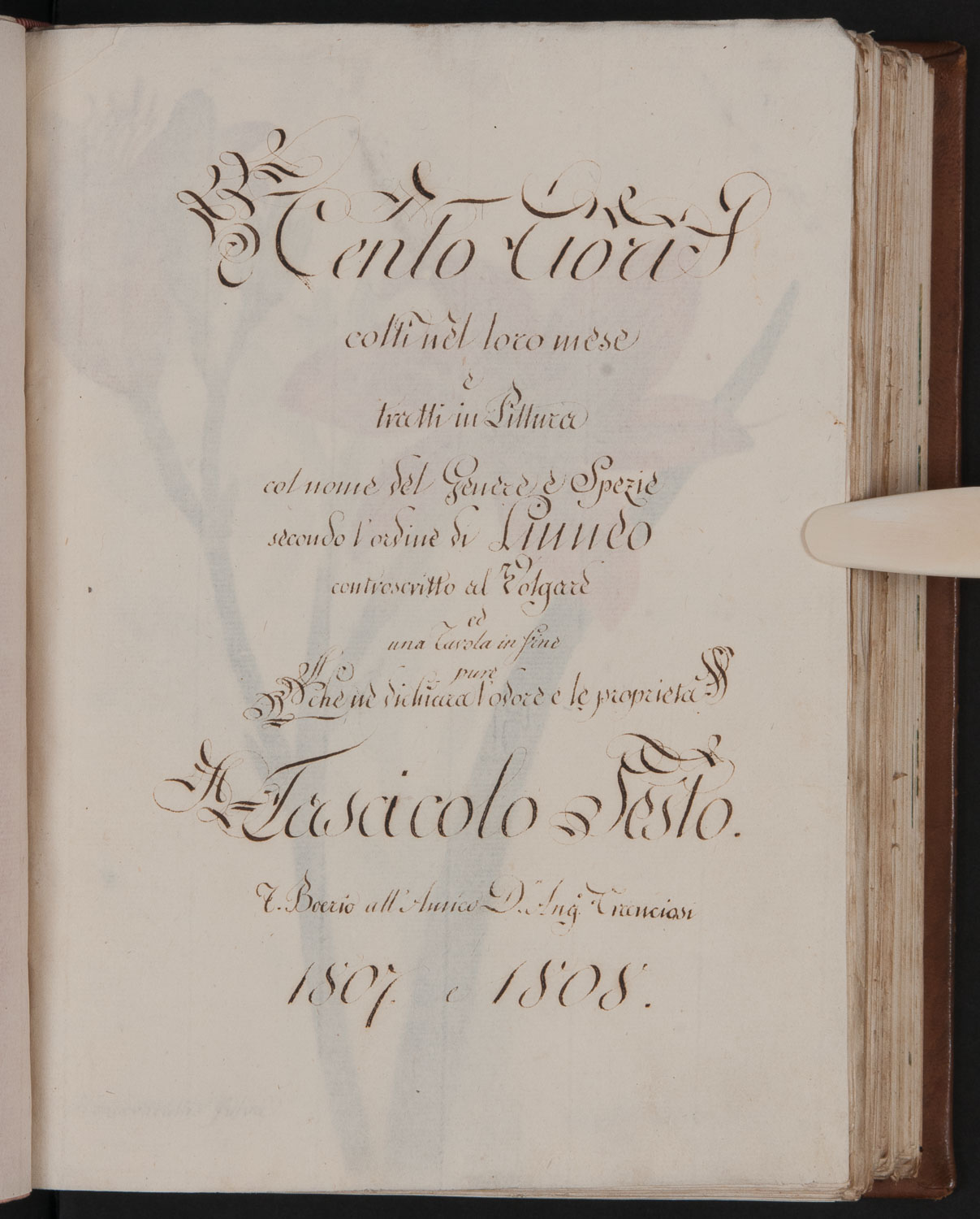 Testo del frontespizio: Cento fiori colti nel loro mese e tratti in pittura col nome del genere e spezie secondo l'ordine di Linneo controscritto al volgare ed una tavola in fine pure che ne dichiara l'odore e le proprietà. Fascicolo Sesto. F. Boerio all'amico D. Ang. Franciosi. 1807 e 1808 Secondo volume di un’opera in tre volumi dell’abate Franciosi, raffigurante piante che crescono spontanee in Veneto, nel litorale e piante ornamentali o che si coltivano negli orti. Ogni volume è suddiviso in fascicoli con circa 100 tavole ciascuno, ogni fascicolo si conclude con un prospetto cronologico con il giorno di raccolta delle piante e il nome scientifico e volgare ed è seguito da un capitolo relativo alle proprietà medicinali delle piante e a poesie ed allegorie botaniche di diversi autori. Le tavole, di pregevole fattura artistica, sono scientificamente precise e permettono una facile identificazione delle piante raffigurate; in alcune sono presenti anche figure analitiche dello spaccato dei fiori e dei frutti.