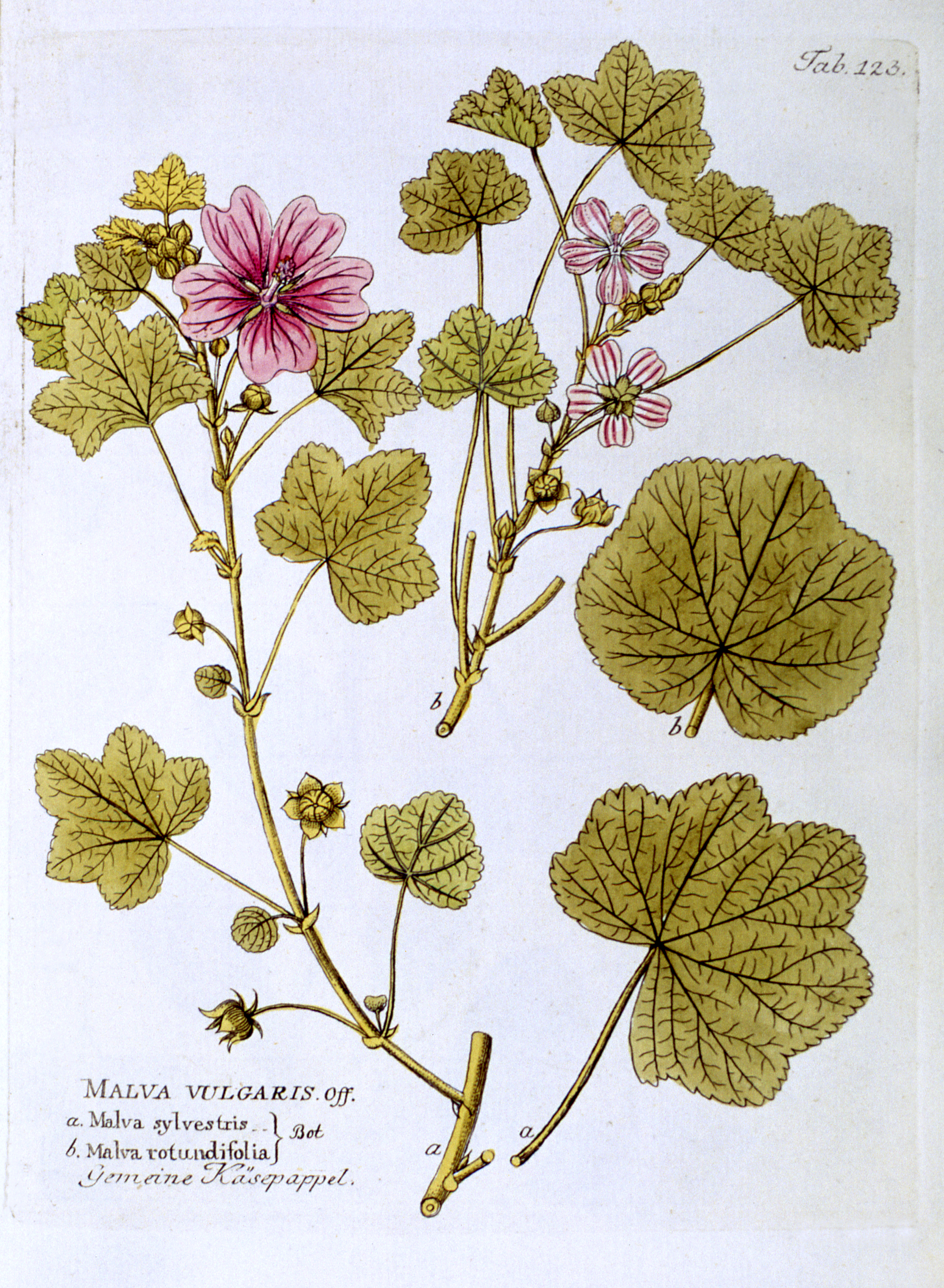 Malva vulgaris off. - a. Malva sylvestris, b. Malva rotundifolia bot.