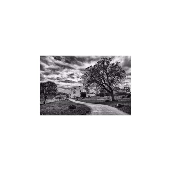 L'istantanea in oggetto, scattata in bianco e nero, fa parte di una più ampia raccolta di fotografie realizzate per il progetto di censimento di 248 masserie pugliesi avviato da Giancarlo Chielli, professore del corso in Beni Culturali e Ambientali presso l'Accademia di Belle Arti di Bari. Il lavoro svolto ha dato vita al volume “Le masserie di Puglia come Bene Culturale” in cui sono presenti alcuni scatti di masserie pugliesi tra cui questa presa in esame. Lo scatto ci conduce all'interno della masseria Aprile e ci regala la visione d'insieme che si ha una volta varcato il cancello d'ingresso. L'immagine dunque si compone di diversi elementi caratterizzanti come il muretto a secco sulla sinistra che un tempo delimitava gli spazi abitati da quelli coltivati, l'aia sulla destra ed il viale sterrato che conduce all'antica struttura abitativa del signore latifondista visibile in profondità. La masseria Aprile, tipica costruzione rurale pugliese costruita nel 1700, sorge nel cuore della Valle d'Itria ai piedi di Locorotondo, comune pugliese riconosciuto tra i borghi più belli d'Italia. L'intero complesso edilizio, immerso nella campagna e circondato da uliveto e vigneto, è caratterizzato da un corpo centrale in pietra ad uso abitativo, una annessa cappella di famiglia e una serie di trulli del XVII secolo destinati in origine al ricovero degli animali, al deposito della legna, alla conservazione del formaggio, del vino, del foraggio. La tenuta è stata ristrutturata nel 1992 dagli eredi proprietari seguendo i tradizionali criteri di conservazione dei maestri trullari della zona. Oggi oltre ad essere residenza degli stessi eredi ha perso la funzione d'uso originaria ed è stata trasformata in un rinomato bed and breakfast.