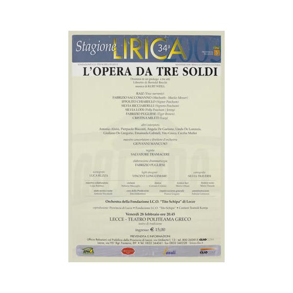 L'immagine in oggetto riproduce la locandina dello spettacolo "L'opera da tre soldi", dramma in tre atti di Bertold Brecht. Si tratta di un'opera messa in scena per la 34° stagione lirica della Fondazione Tito Schipa di Lecce, per la quale il Teatro Koreja fu coproduttore con la Fondazione e la Provincia di Lecce. La locandina, dal carattere stilistico puramente informativo, riporta interpreti, attori ed autori dell'opera, tra i quali si riconoscono anche alcuni protagonisti della storia del Teatro Koreja, primo tra tutti Salvatore Tramacere che fu regista del dramma in tre atti.