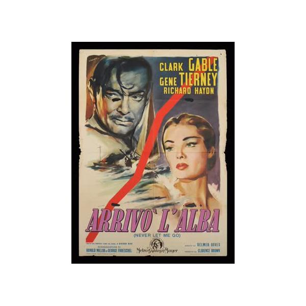 L'immagine riproduce uno dei manifesti conservati presso la Mediateca Regionale Pugliese (vedi Note). Si tratta di una delle versioni grafiche del manifesto del film "Arrivò l’alba" del 1953 per la regia di Delmer Daves. Il manifesto, a firma dell’illustratore V. Parente, presenta i primi piani dei due protagonisti principali il giornalista statunitense Philip Sutherland (Clark Gable) e la sua amata Marya (Gene Tierney), una ballerina di danza classica in Russia, impossibilitati a sposarsi a causa dei rapporti ostili tra il Paese sovietico e quelli occidentali, infatti il governo russo vieta il matrimonio tra russi e stranieri e non concede permessi di espatrio ai propri connazionali. Questa separazione è ben raffigurata anche graficamente da una spessa linea rossa tra i due amanti che hanno sullo sfondo un mare agitato ed il battello che potrebbe rappresentare la loro ancora di salvezza. I colori predominanti tendono alle sfumature del nero/grigio, solo per Gene Tierney, Parente utilizza colori chiari che ne illuminano il volto.