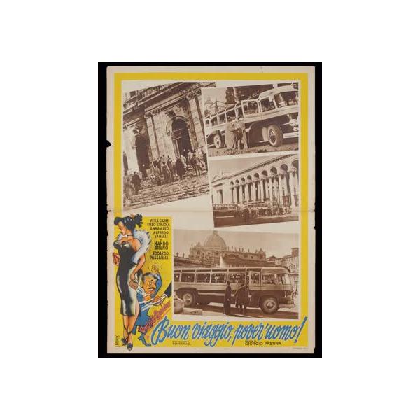 L'immagine riproduce uno dei manifesti conservati presso la Mediateca Regionale Pugliese (vedi Note). Si tratta della locandina del film "Buon viaggio, pover'uomo!", in cui appare una illustrazione di Kremos. Nome d'arte di Niso Ramponi, fu un disegnatore dalle qualità eccezionali; seppe contraddistinguersi per il suo stile fumettistico che esaltava la donna, con forme sensuali volutamente accentuate, in pieno stile pin-up. Non a caso, fu ironicamente soprannominato il "Sovrano di donnine" de Il Travaso, uno dei più popolari giornali umoristici italiani del Novecento. La collaborazione con il giornale iniziò nel 1948 e le sue figure femminili in copertina portarono ad un aumento notevole delle tirature. Riconoscibili e bellissime, le donne di Kremos sono affascinanti e procaci, incarnano il prototipo femminile dell'epoca. In effetti, la locandina in oggetto cattura lo sguardo del pubblico con la sua illustrazione, che completa la composizione grafica realizzata con scene girate a Roma tratte dal film. Kremos lavorò negli anni '50 come cartellonista cinematografico in esclusiva con diverse major come Columbia Ceiad, Republic Pictures Corporation, RKO, etc... e realizzò numerose locandine cinematografiche tra cui quelle per Biancaneve e i sette anni e Cenerentola di Walt Disney.