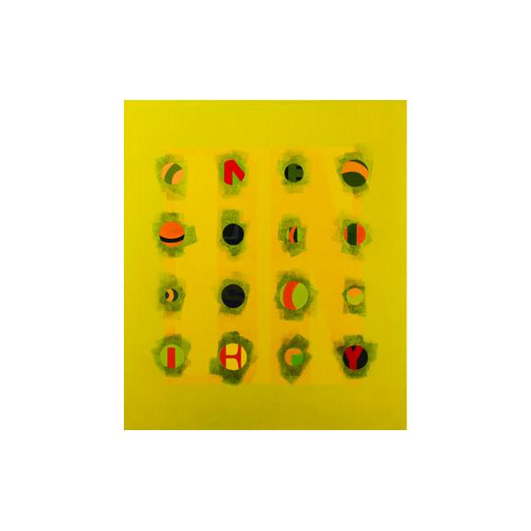 L'immagine digitale riproduce “Society”, lavoro di Paolo Lunanova, tra i più influenti e attivi artisti nel panorama artistico locale e internazionale sin dagli anni '70, già professore assistente presso le Accademie di Napoli, Lecce e Bari, dove ha ricoperto il ruolo di docente di Tecniche e Tecnologie della Decorazione. Agli inizi della sua carriera, Lunanova era attratto dalla figura umana, principale soggetto delle sue opere, specialmente per la volontà di riprodurla attraverso la pittura. La svolta avviene nei decenni successivi, quando passa gradualmente a rappresentare l'uomo tramite gli oggetti presenti nella sua quotidianità; fino alla produzione più recente, degli anni 2000, nella quale elimina completamente ogni riferimento ad essa per concentrarsi su una pittura astratta che allude comunque al mondo consueto e giornaliero, come in “Cinema”, smalto acrilico su tela, presente in collezione. Anche “Society” richiama la dimensione dell'uomo, annullata dal completo rigore della geometria e dell'astratto che copre quasi completamente le lettere che si intravedono al di sotto dei piccoli cerchi: piccoli spiragli nei quali osservare il mondo.